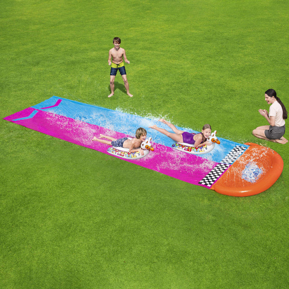 Se fram emot riktigt skojig vattenlek en dubbel vattenbana och uppblåsbara lamadjur att åka på, perfekt vattenrutschbana och leksak för alla barn en varm sommardag. Med Bestway vattenglidbana kan ni åka två stycken bredvid varandra på era lamor, superkul dubbel vattenbana och vattenrutschbana. Riktigt skojig water slide och vattenrutschkana för alla barn som vill ha rolig vattenlek.