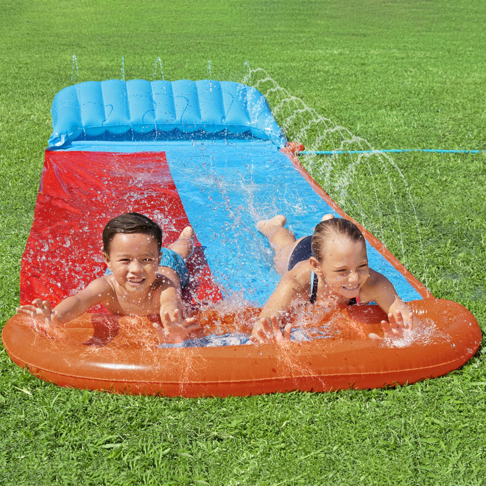 Rolig dubbel vattenbana för rolig vattenlek och vattenaktivitet, perfekt för alla barn som vill ha en skojig Bestway vattenglidbana och leksak till varma dagar under sommarlovet. Med en dubbel vattenrutschbana och water slide får dina barn garanterat massor av kul!