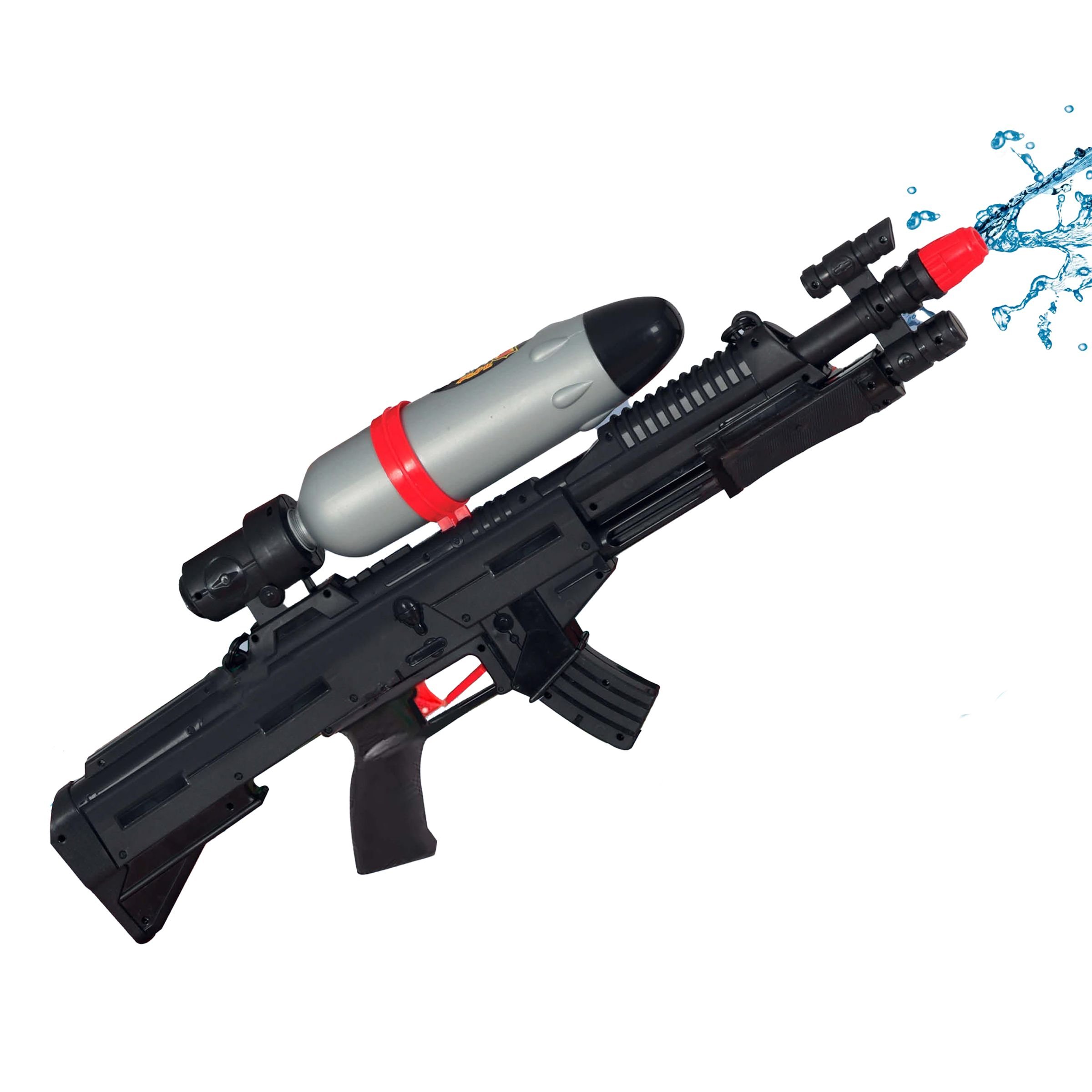 Vattenpistol Gevär är designad som ett rejält gevär, komplett med detaljer som får den att se ut som något hämtat direkt ur ett actionspel. Framtill sitter ett klassiskt sprutmunstycke i röd plast, redo att avlossa en rejäl vattenstråle på nästa intet ont anande motståndare.