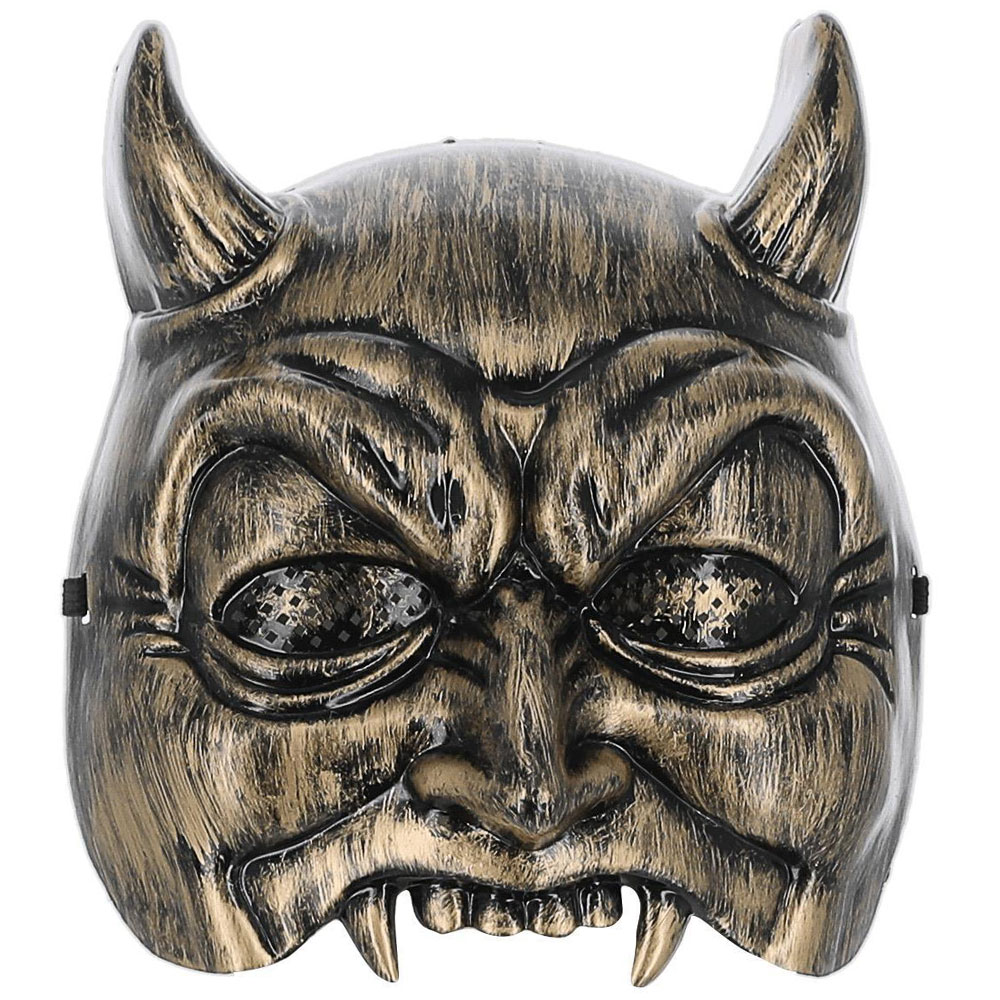 Venetiansk Djävulsmask omfattar en guldfärgad och svart halvmask med motiv av en djävul. Masken har en vit skumkudde vid pannan och ett svart elastiskt band som håller den på plats.