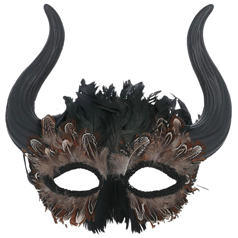 – Maskeradmask med fjädrar och horn.