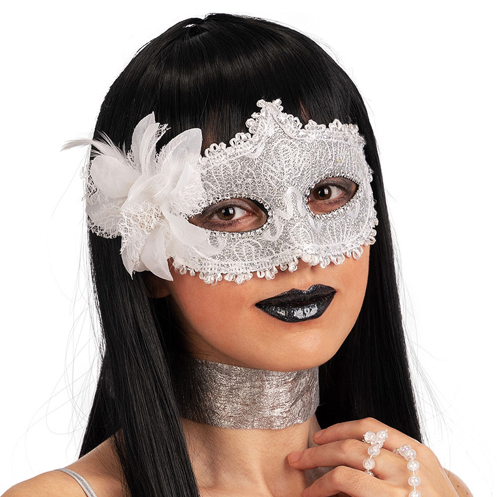 Venetiansk Ögonmask Damast Vit omfattar en maskeradmask med vitt mönstrat tyg med glitter och en stor vit blomma. Masken har två tunna band att knyta runt huvudet.