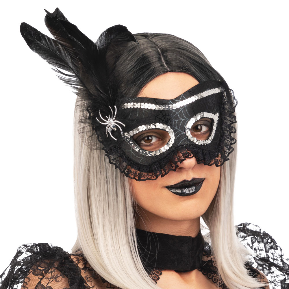 Venetiansk Ögonmask Spindelnät Svart omfattar en svart mjuk maskeradmask med motiv av spindelnät, svart spets, paljetter i silver, fjädrar och en spindel i silver.