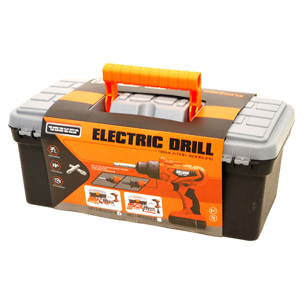 – Leksaksverktygslåda med skruvdragare och tillbehör.