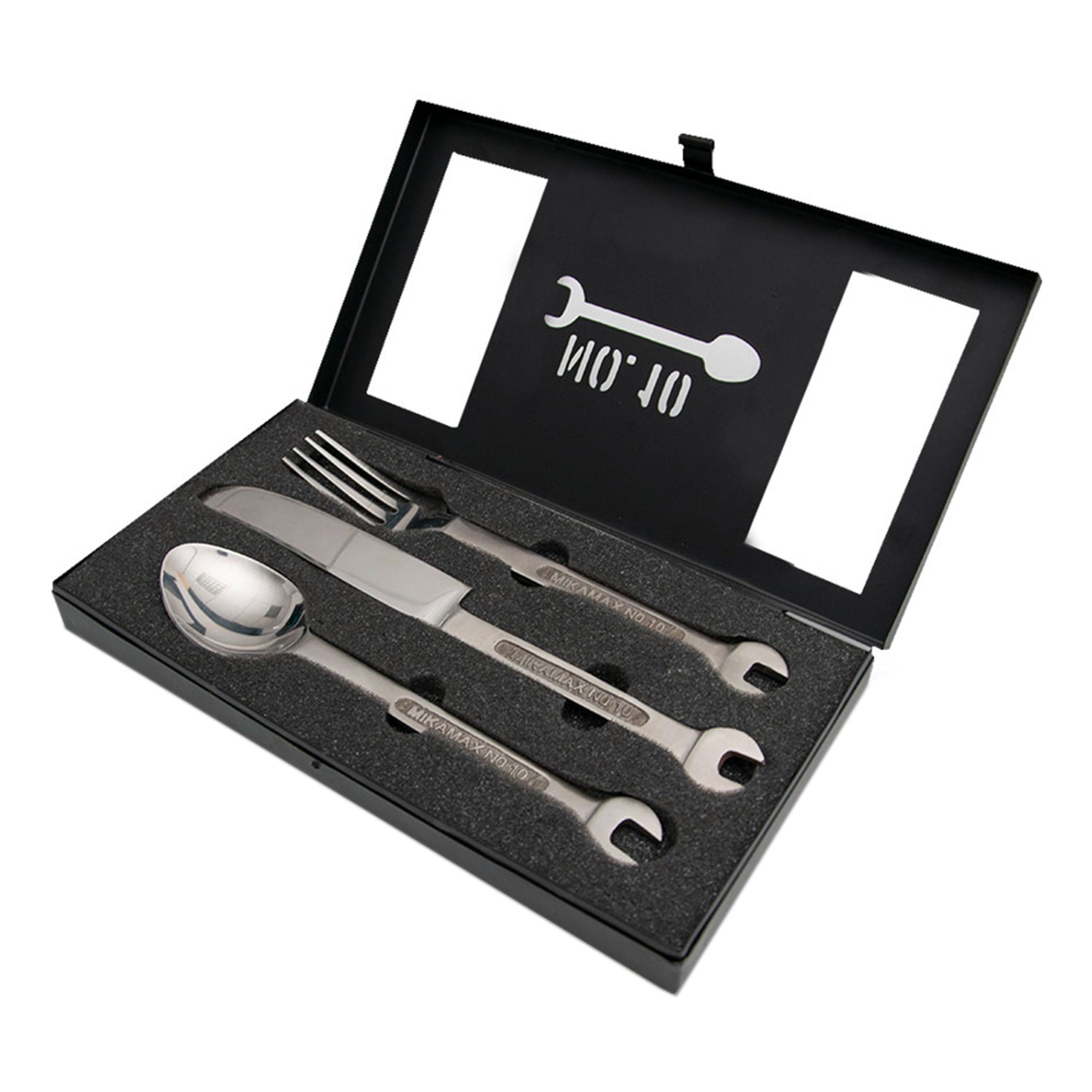 Verktygsbestick Presentlåda levereras i snygg presentbox och inkluderar en sked, en gaffel och en kniv – samtliga med en ände som fungerar som skiftnyckel.