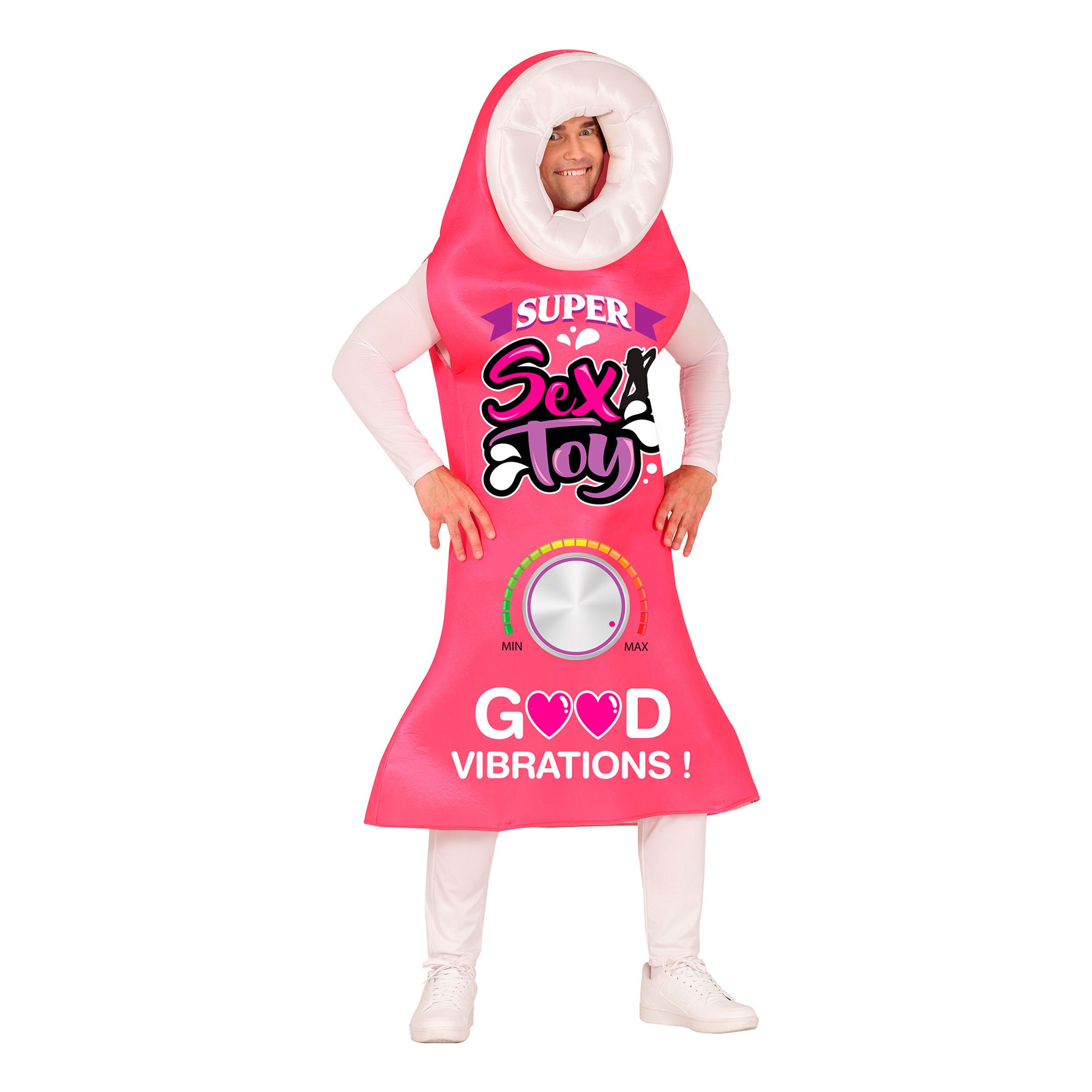 Vibrator Maskeraddräkt är en rosa helkroppsdräkt som föreställer en vibrator, med texten 'Sex Toy' på magen. Dräkten har öppningar för armar, ben och ansikte och finns i en storlek som passar de flesta vuxna.
