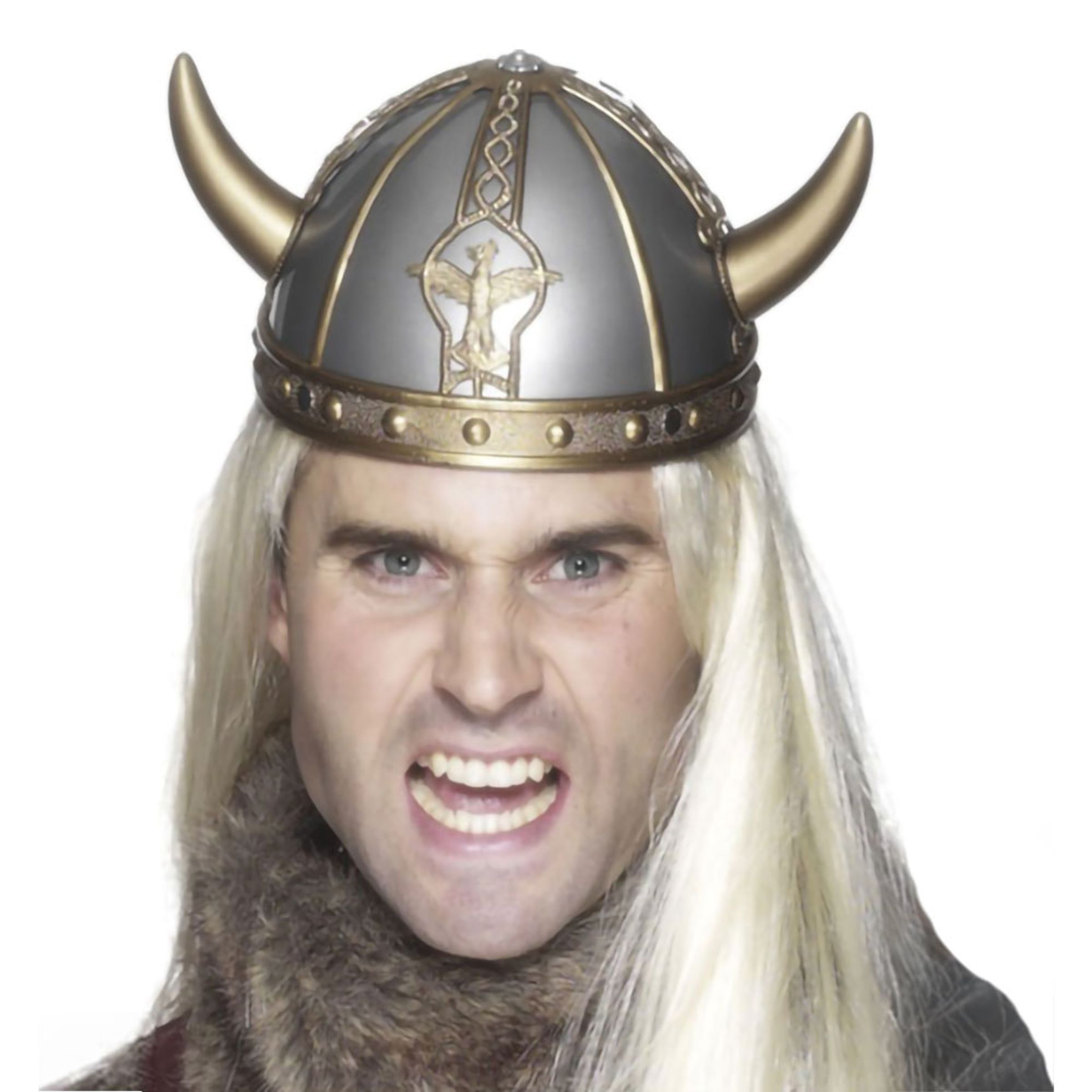 Mångsidig vikingahjälm av plast som med fördel kan användas på maskeraden, eller varför inte för att heja fram Sverige i stundande fotbollskval? Vikingahjälm med horn är i vuxenstorlek och tillverkad