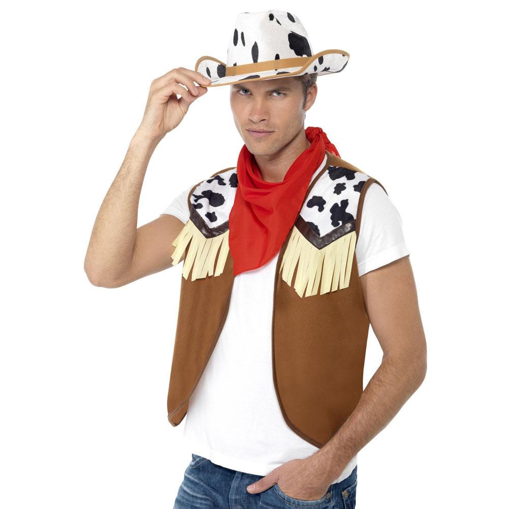 Vilda Västern Cowboy Kit består av ett kit med en brun väst i filtliknande tyg med fransar och ko fläckiga axlar, en cowboy hatt i ko fläckig mockaimitation och en röd scarf.