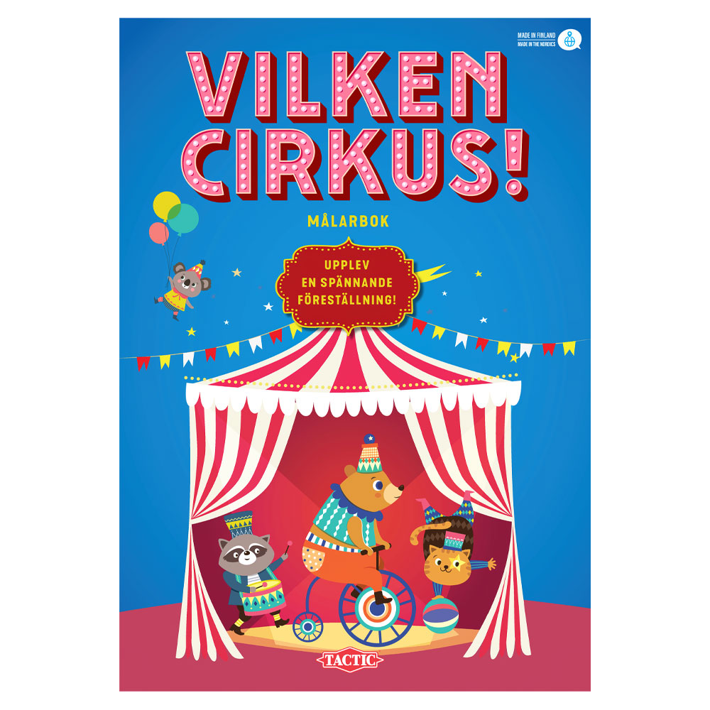 Vilken Cirkus! Målarbok omfattar en målarbok med flera olika motiv av djur som gör cirkuskonster. Målarboken är ca 29,5 cm hög och 21 cm bred.