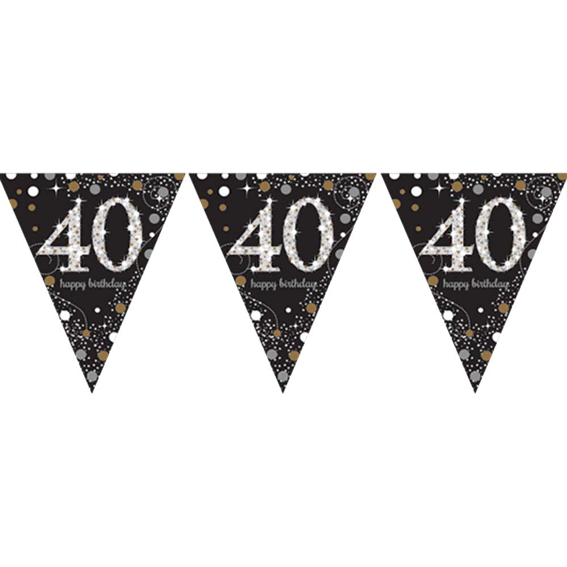 Vimpelgirlang 40 Guld/Silver Glitter består av en girlang fylld av vimplar med texten "40 Happy birthday" på. Perfekt till födelsedagen!
