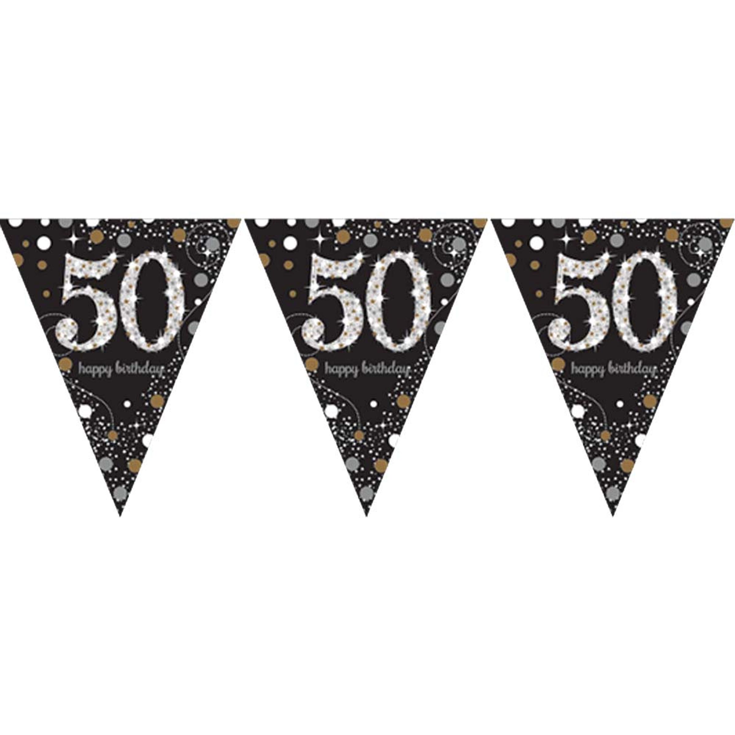Vimpelgirlang 50 Guld/Silver Glitter består av en girlang fylld av vimplar med texten "50 Happy birthday" på. Perfekt till födelsedagen!