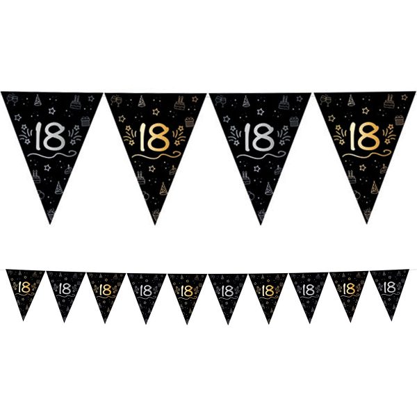 Vimpelgirlang Svart 18 år omfattar en vimpelgirlang med tio svarta flaggor, dekorerade med siffran 18, prickar och stjärnor i guldfärg samt tårtor, stjärnor, partyhattar och dricksglas i silverfärg.