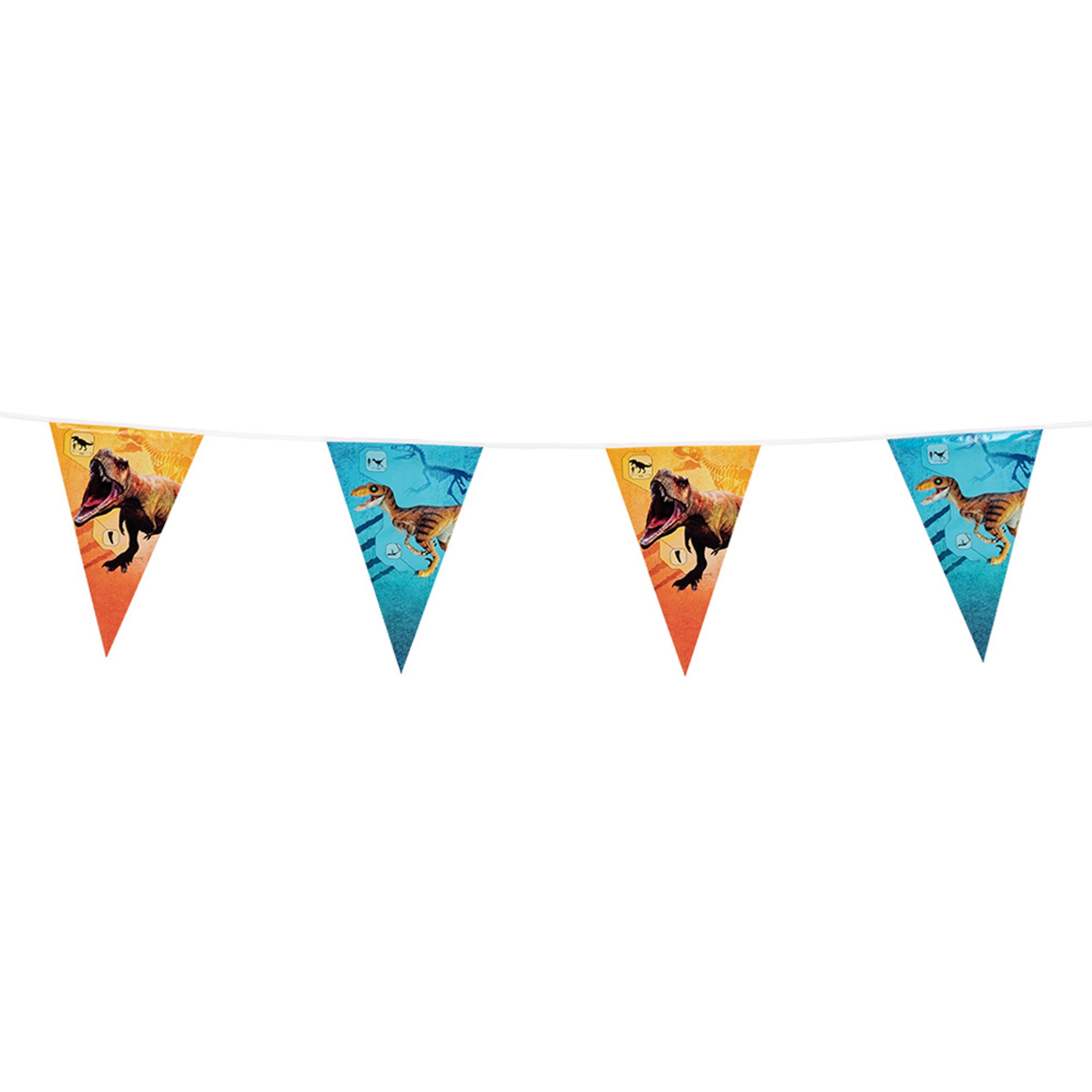 Vimpelgirlang T-Rex är en häftig girlang som kommer med två olika motiv föreställande dinosaurier. Matcha gärna med dukning och andra dekorationer ur samma kollektion för ett fullbordat tema på barnkalaset.