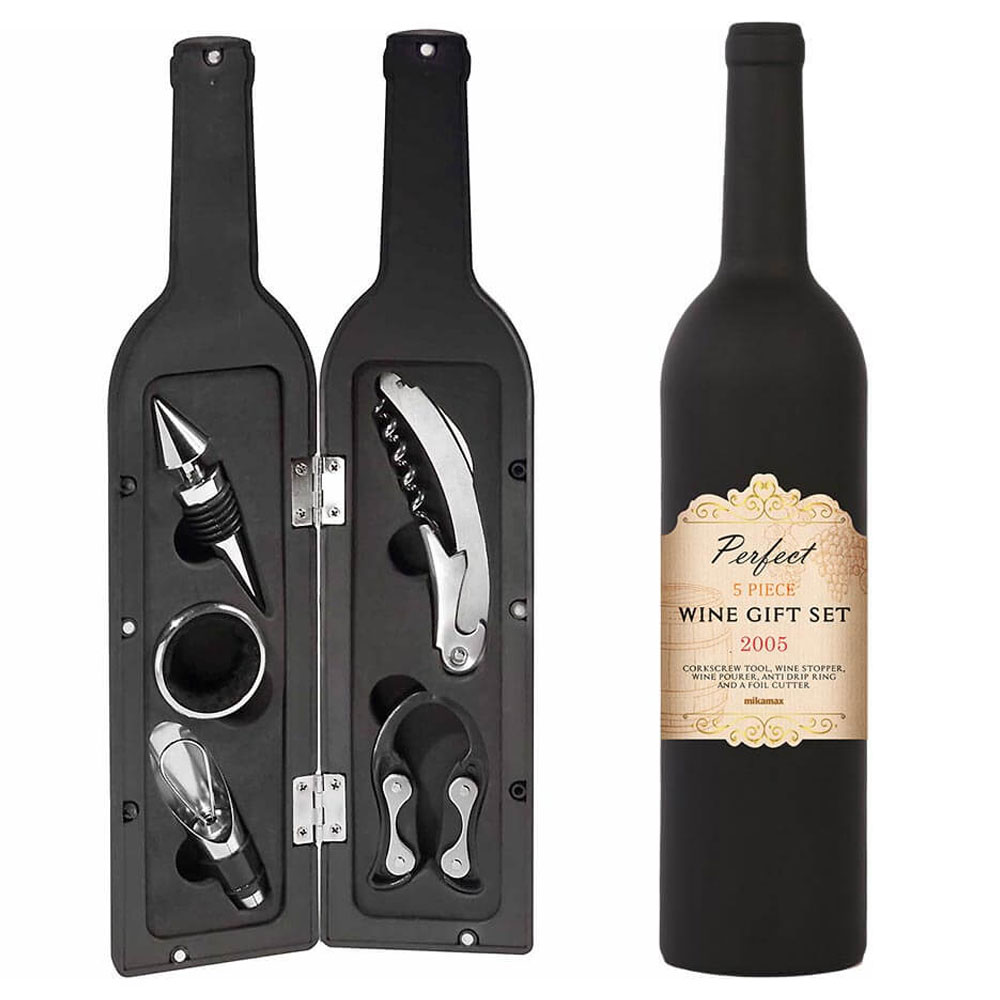 Vinflaska Present Kit består av ett praktiskt vintillbehörskit med allt en vin-älskare kan tänkas behöva. Tillbehören kommer i en snygg förpackning som ser ut som en svart vinflaska med ljus etikett. Tillverkade av plast och rostfritt stål.