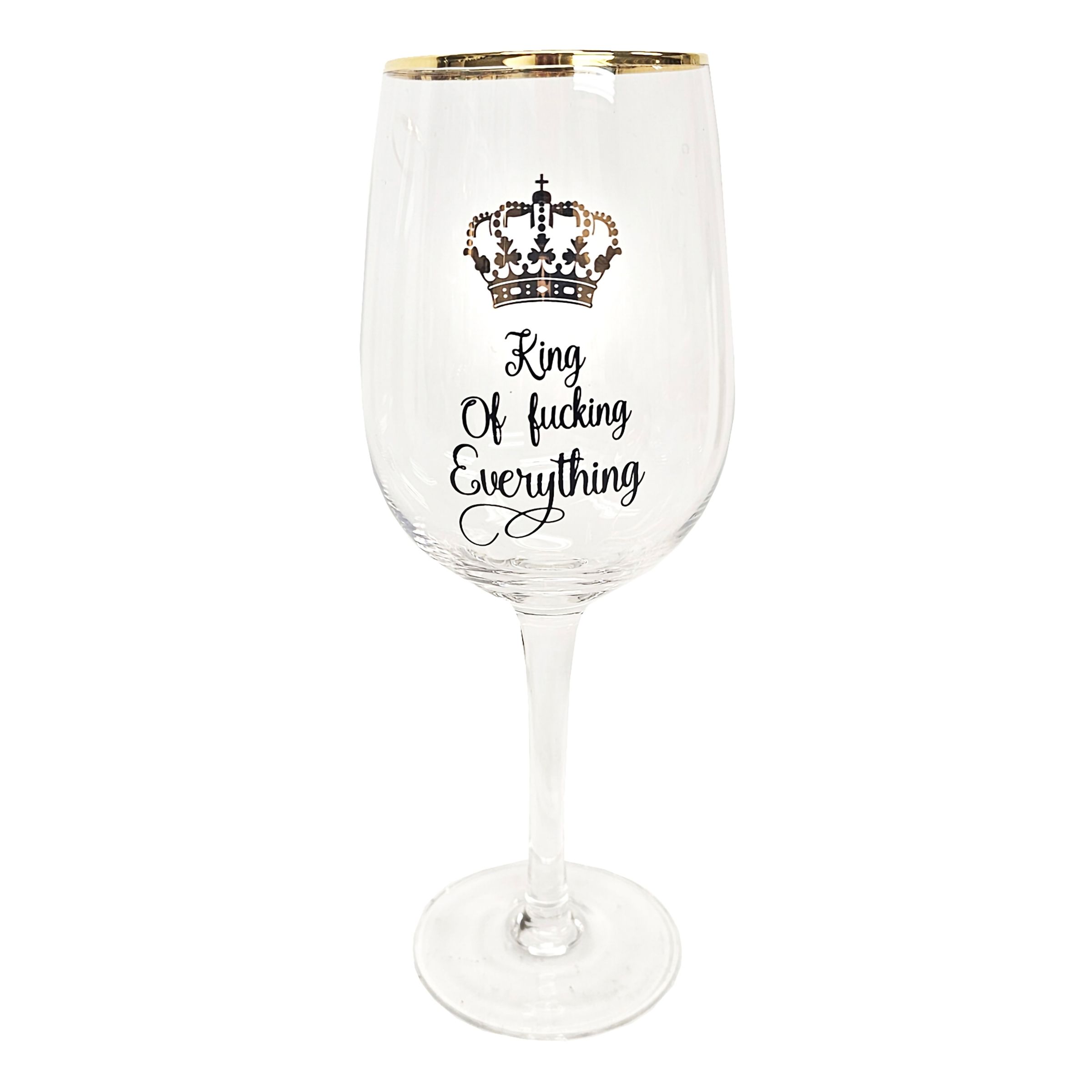 Vinglas King / Queen är ett snyggt vinglas med guldkant. Glaset kommer i två olika varianter där det står "Queen of fucking Everything" och "King of fucking Everything" med en krona på.