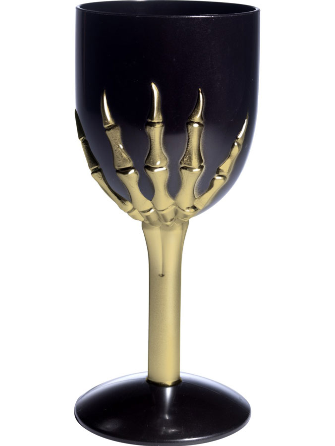 Vinglas med Skeletthand är tillverkad av plastmaterial och omfattar ett skimrande, svart vinglas med ett silverfärgat skeletthand.