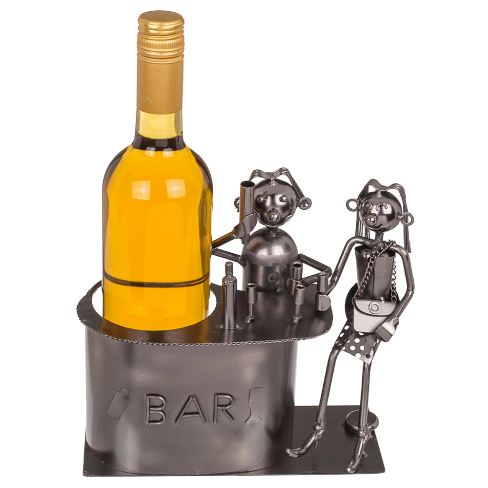 Med en så här snygg flaskhållare så passar man sig nästan för att tömma flaskan. Detta vinställ är i form av en bar med bartender och kund i metall. Behöver man en gå bort present så är denna vinhållare tillsammans med en flaska vin ett perfekt val!