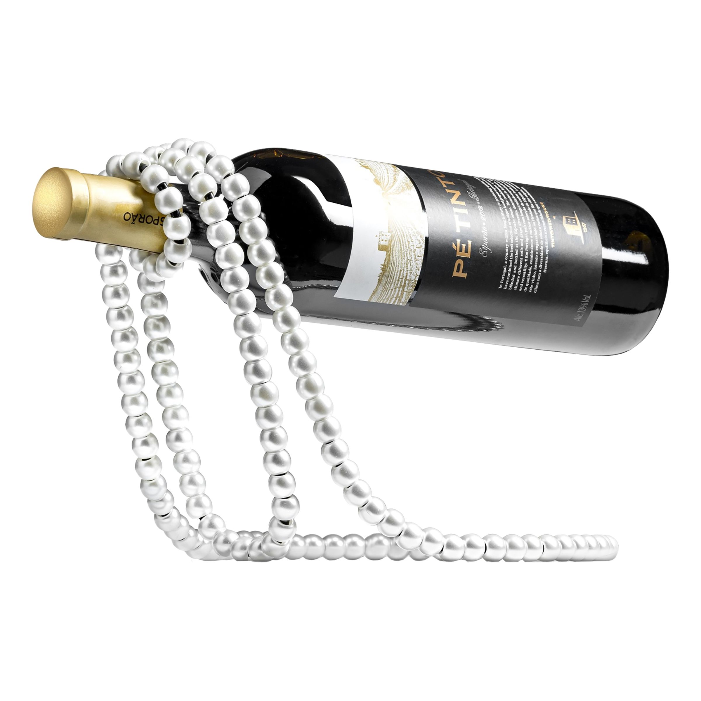 Det här vinstället är magiskt elegant. Det ser ut som ett pärlhalsband men istället för formbart är pärlorna stabila och formade som ett vinställ med plats för en flaska. Vinhållaren är en fantastisk present att ge bort till vännen som gillar vin och lite lyxiga saker. Mycket läckert att ha stående på bänken i köket eller på en hylla i vardagsrummet.