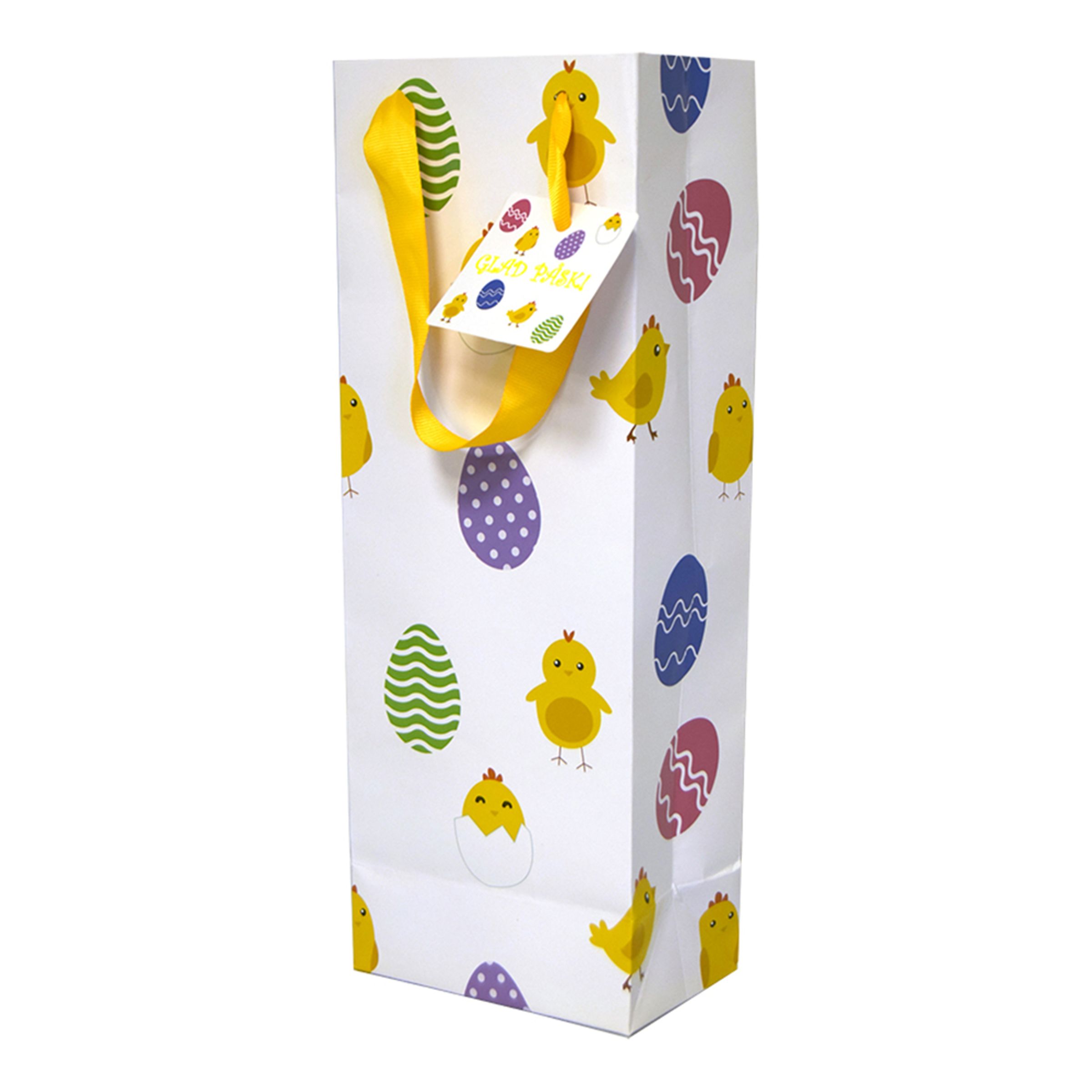 Vinpåse Glad Påsk är gjord i papp och har ett litet kort där du kan skriva en hälsning. Med kyckling och äggmotiv blir det ett påskägg för vuxna kan man säga.