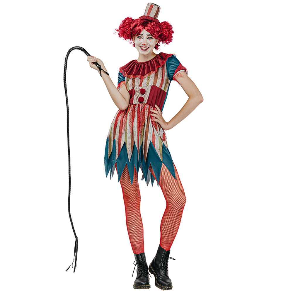Vintage Clownklänning omfattar en klassisk clownklänning i röd, blå och vit med ränder i brun, grön och röd. Klänningen har en stor krage, två röda bollar på magen, röda nättygsdetaljer och är färgad att se smutsig ut. Ingår även ett diadem med en liten röd och vit hatt.