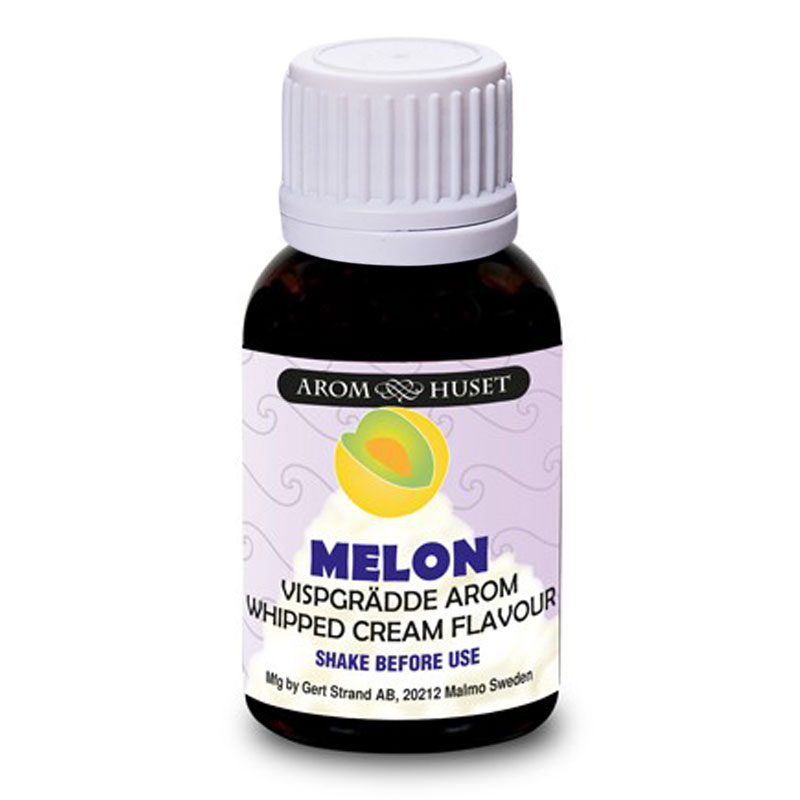 Vispgrädde Melon Arom omfattar en liten flaska innehållande en god melonarom som du blandar ihop med vanlig vispgrädde från matbutiken. Blandningen ändrar både smak, doft och färg på gräddet.