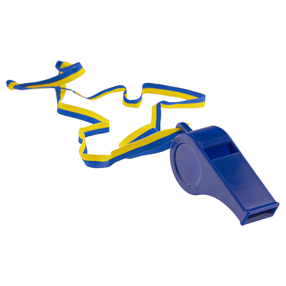 Visselpipa med Band Blå och Gul omfattar en blå visselpipa i plast med långt band i blå och gul polyester att hänga om halsen. Visselpipan är ca 4,5 cm lång och 1,5 cm bred.