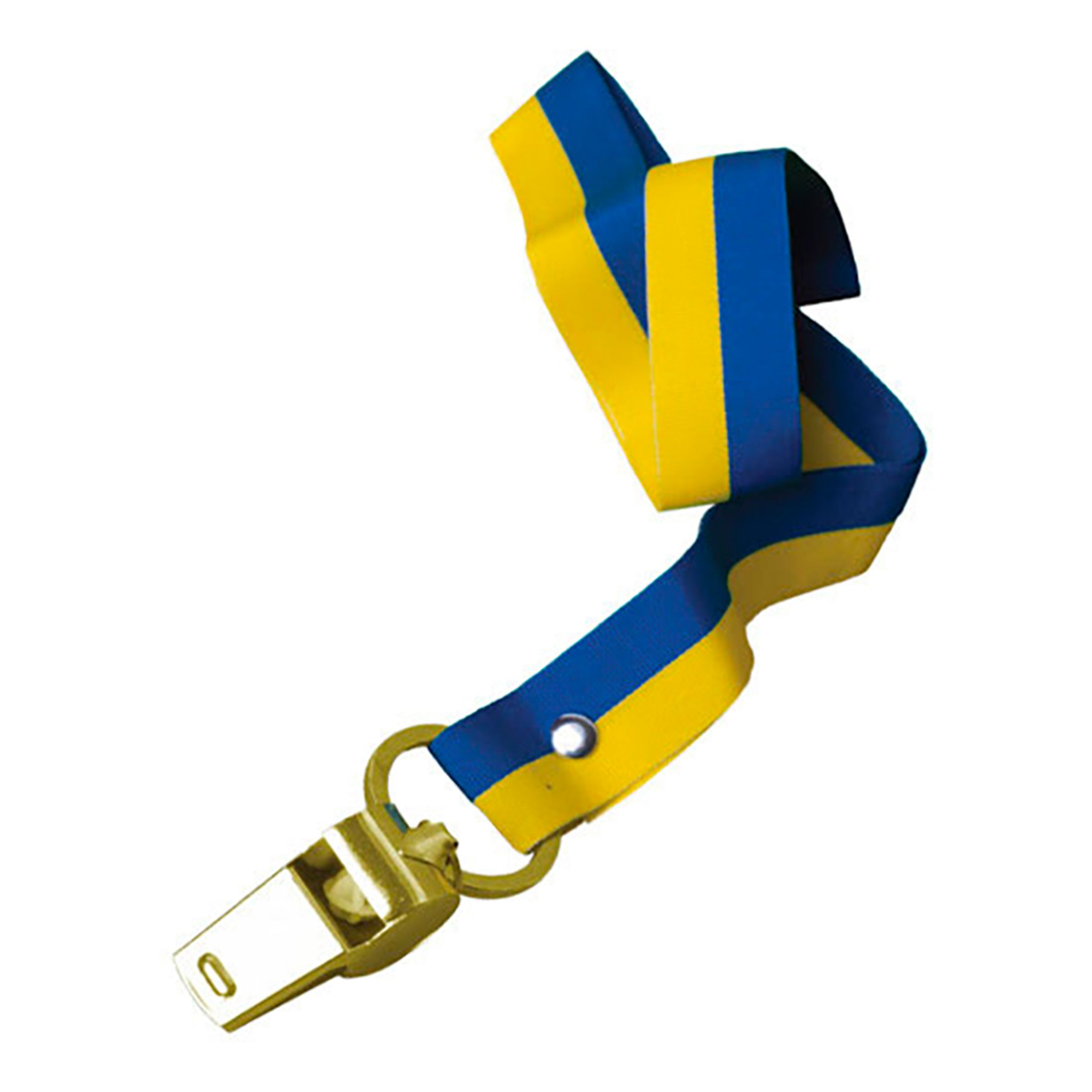 Visselpipa på Blå/Gult Band kommer i två varianter. Du kan välja antingen en guldfärgad eller en silverfärgad visselpipa. Bandet som visselpipan hänger på är blått och gult.