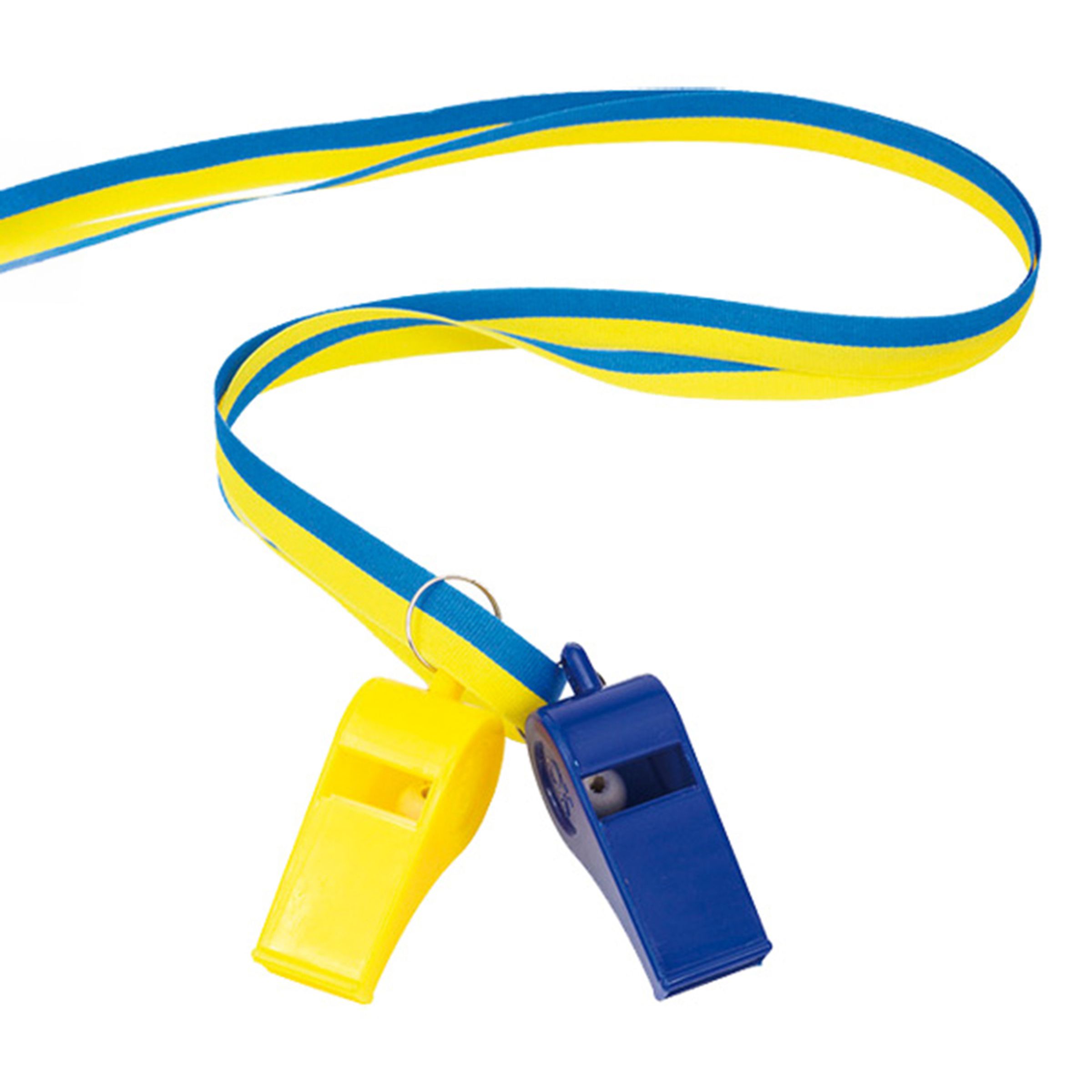 Visselpipor i Band Blå/Gul består av två visselpipor i gult och blått som kommer på ett blågult band som du kan hänga runt studentens hals.