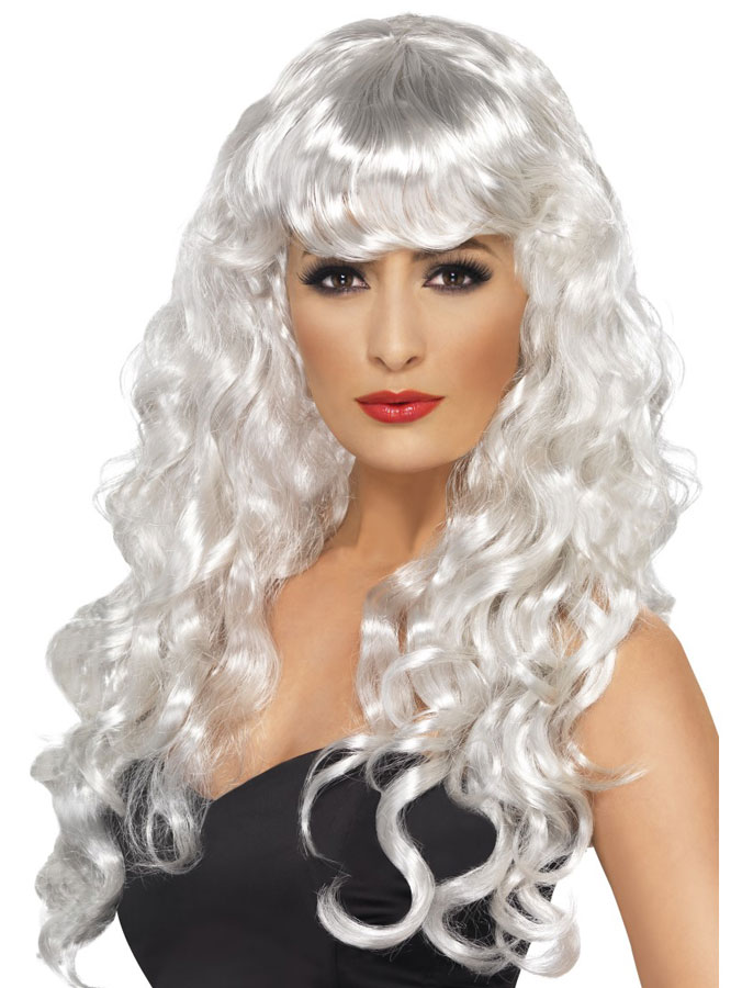 Vit Lockig Peruk Siren omfattar en lång, snövitfärgad peruk med lockar och lugg.