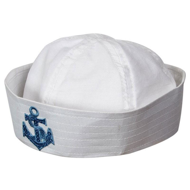 Vit Matroshatt omfattar en vit sjömanshatt tillverkad av vitt tyg med styvare tyg ovanpå för en stabil form. Hatten är dekorerad med ett blåpaljetterat ankaremblem på framsidan.