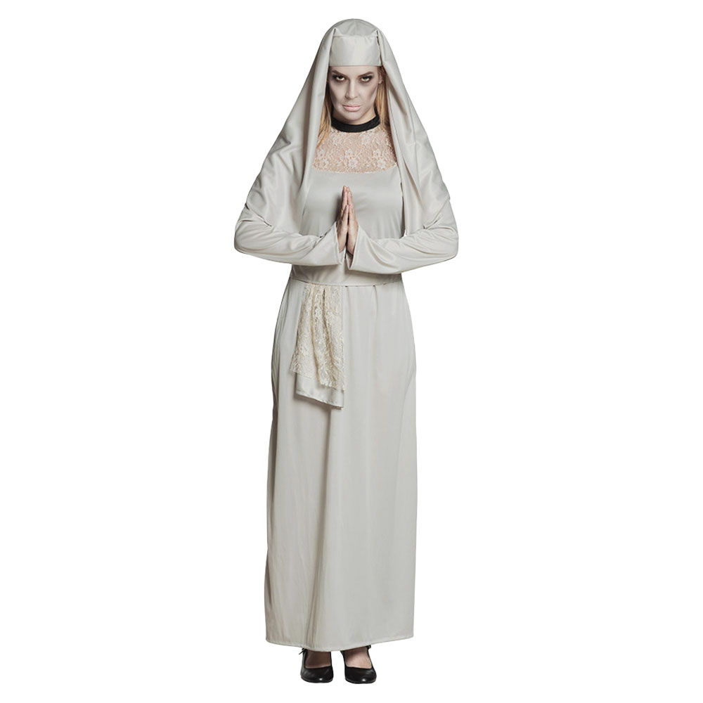 Trots att du vigde ditt liv åt klostret och gud så kom du aldrig till himlen när du lämnade jordelivet. Istället blev du en kuslig spöknunna och hemsöker nu alla du stöter på. Förvandlas till en vit spök-nunna med denna dräkt och få till en riktigt skrämmande kostym till halloween. En komplett nunna maskerad utklädnad som passar perfekt för dig som vill klä ut dig i religiös stil.