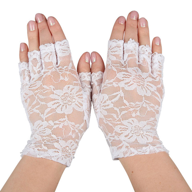Vita Fingerlösa Spetshandskar omfattar ett par blomstermönstrade handskar utan fingertoppar för en mer elegant look. Handskarna är tillverkade av tänjigt spets-material.