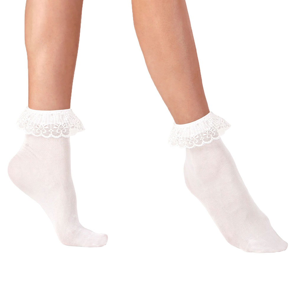 Vita Strumpor med Spets omfattar ett par vita strumpor med söt spetsvolang. Strumporna är tillverkade av nylon och passar vuxna.