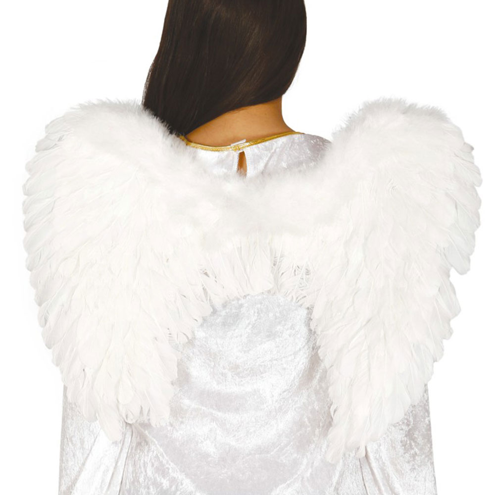 Vita Vingar med Fjädrar omfattar ett par vita vingar med fjädrar. Vingarna fästs på ryggen med hjälp av elastiska band.