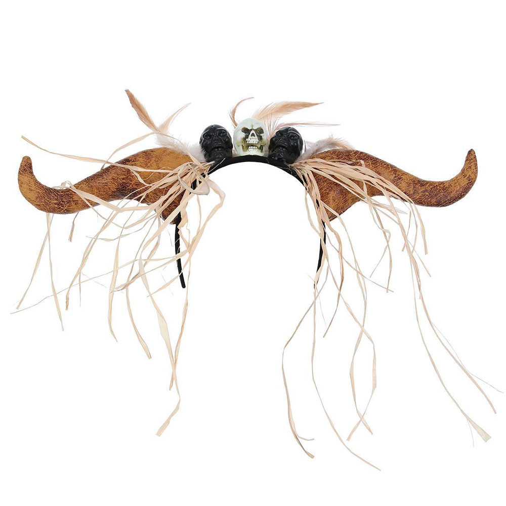 Voodoo Diadem med Horn omfattar ett svart diadem med två mjuka uppstoppade horn, tre svarta och vita dödskallar, fjädrar och massor av strån som liknar vass.