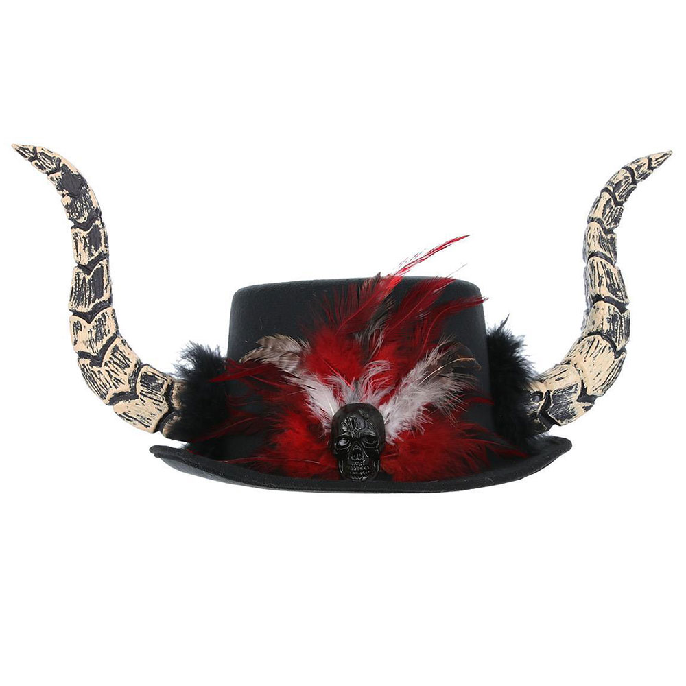 Släpp löst din inre shaman med denna unika Voodoo hatt med horn. En spännande och mystisk accessoar, perfekt som halloween-hatt eller för en maskerad. Hatten, utsmyckad med fjädrar och en dödskalle, har ett exotiskt och kraftfullt utseende som utstrålar både glamour och gruvlighet. Hornen som toppar designen adderar ytterligare till hattens mystik och karaktär. Gör din outfit oförglömlig med denna voodoo-inspirerade kreation.