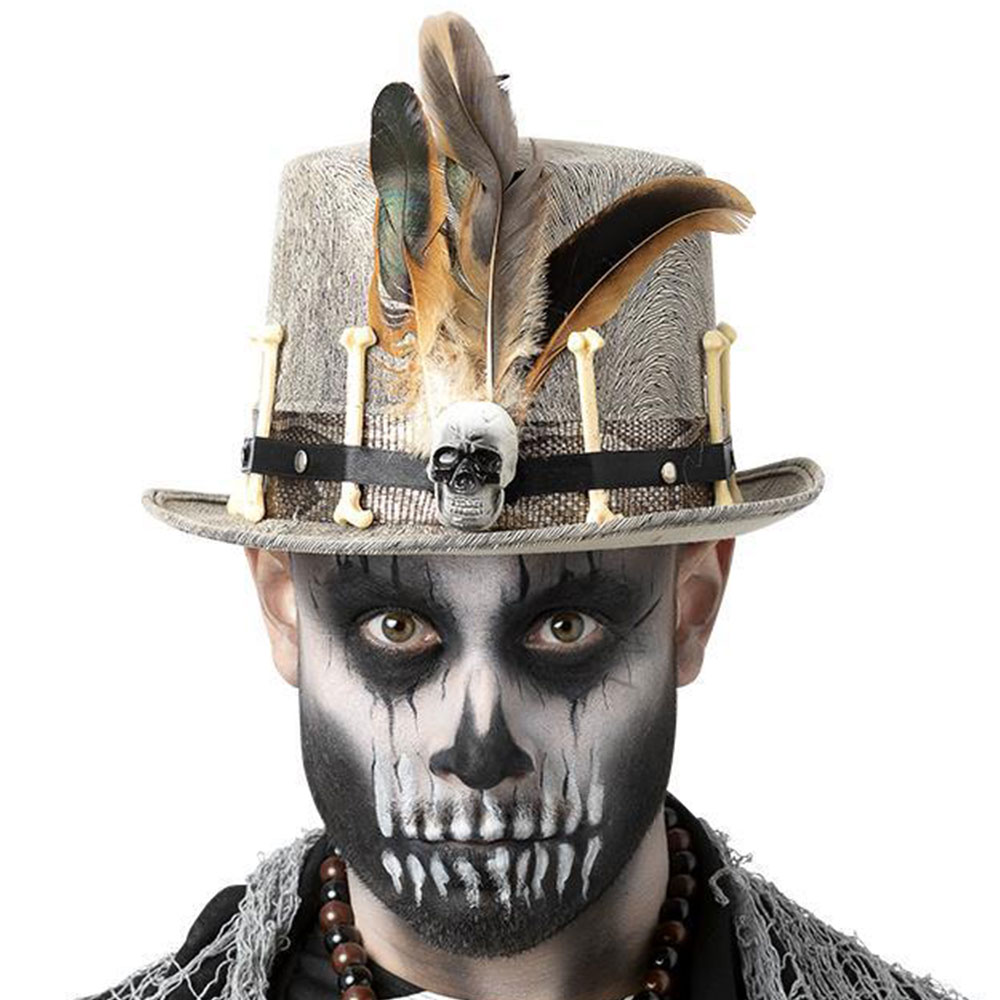 Voodoo Hög Hatt Grå är det ultimata tillbehöret för den som vill sticka ut vid nästa halloweenfest eller maskerad. Med sin distinkta design och unika detaljer som ben, dödskalle och fjädrar, ger denna hatt en mystisk och suggestiv känsla. Bandet runt hatten, med ett mönster likt ormskinn, kompletterar dess fascinerande utseende. Alltså, en halloween-hatt som tar dig till en ny nivå, eller en maskerad-hatt som får alla att vända sig om.