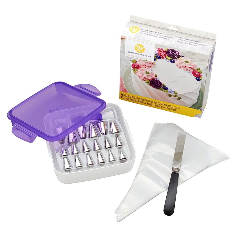 Wilton Deluxe Decorating Set består av ett set med 18 stycken tyllar och 24 stycken stadiga engångs spritspåsar, ett Twist Quick snabbfäste, en vinklad spatel och en förvaringslåda.