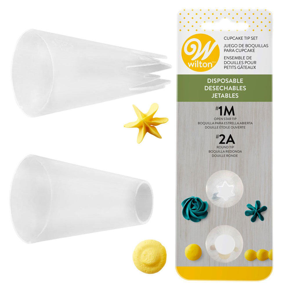 Detta Wilton tyll-set utgör två stycken disponibla sprits-tyllar kallade Open Star Tip 1M och Round Tip 2A, de är idealiska för den som önskar fokusera på det roliga med att dekorera tårtor och andra bakverk istället för att diska.