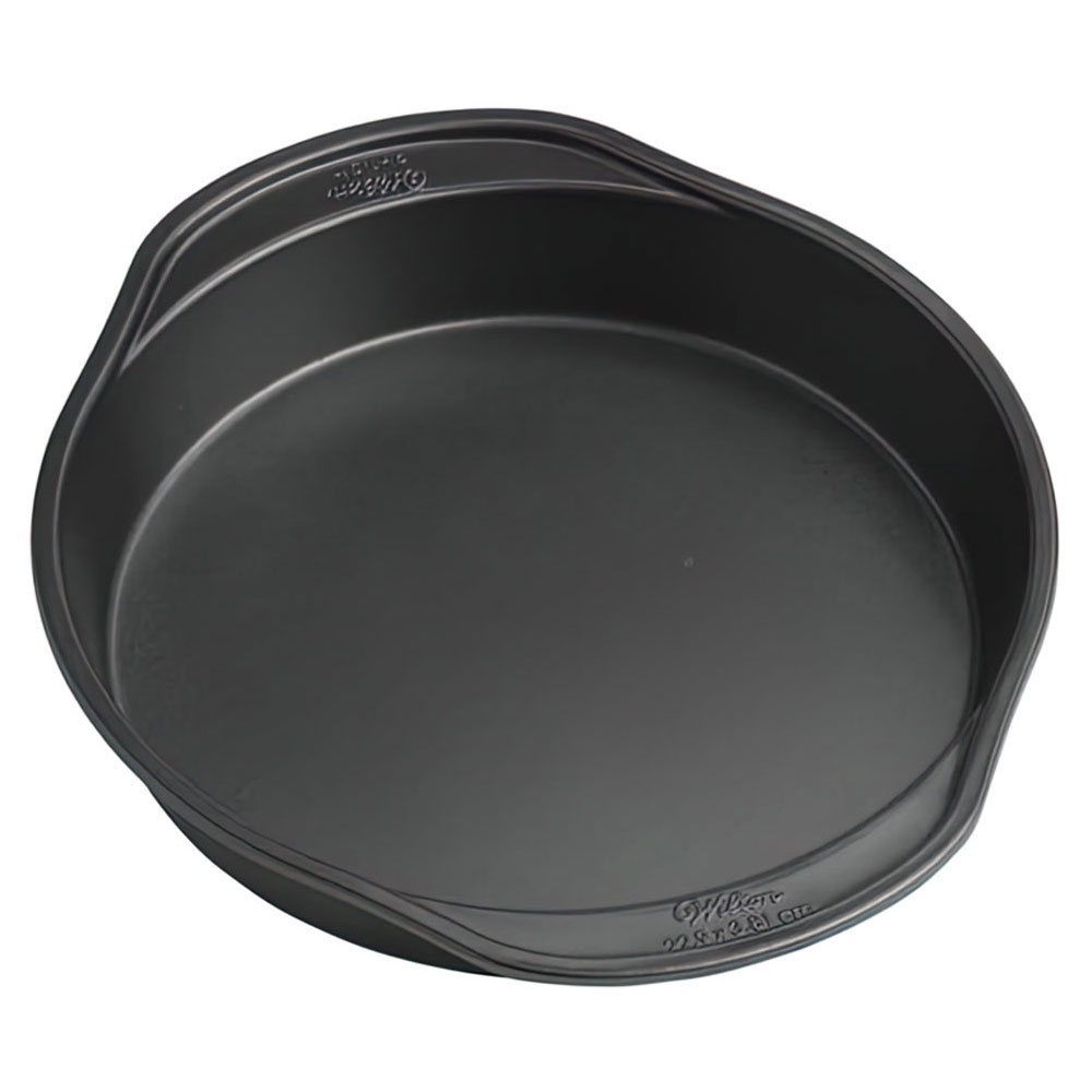 Wilton Round Cake Pan besår av en rund bakform tillverkad av metall med non-stick beläggning. Formen mäter invändigt ungefär 22,5 centimeter i diameter och har en höjd på 4 centimeter. Kan diskas i diskmaskin.