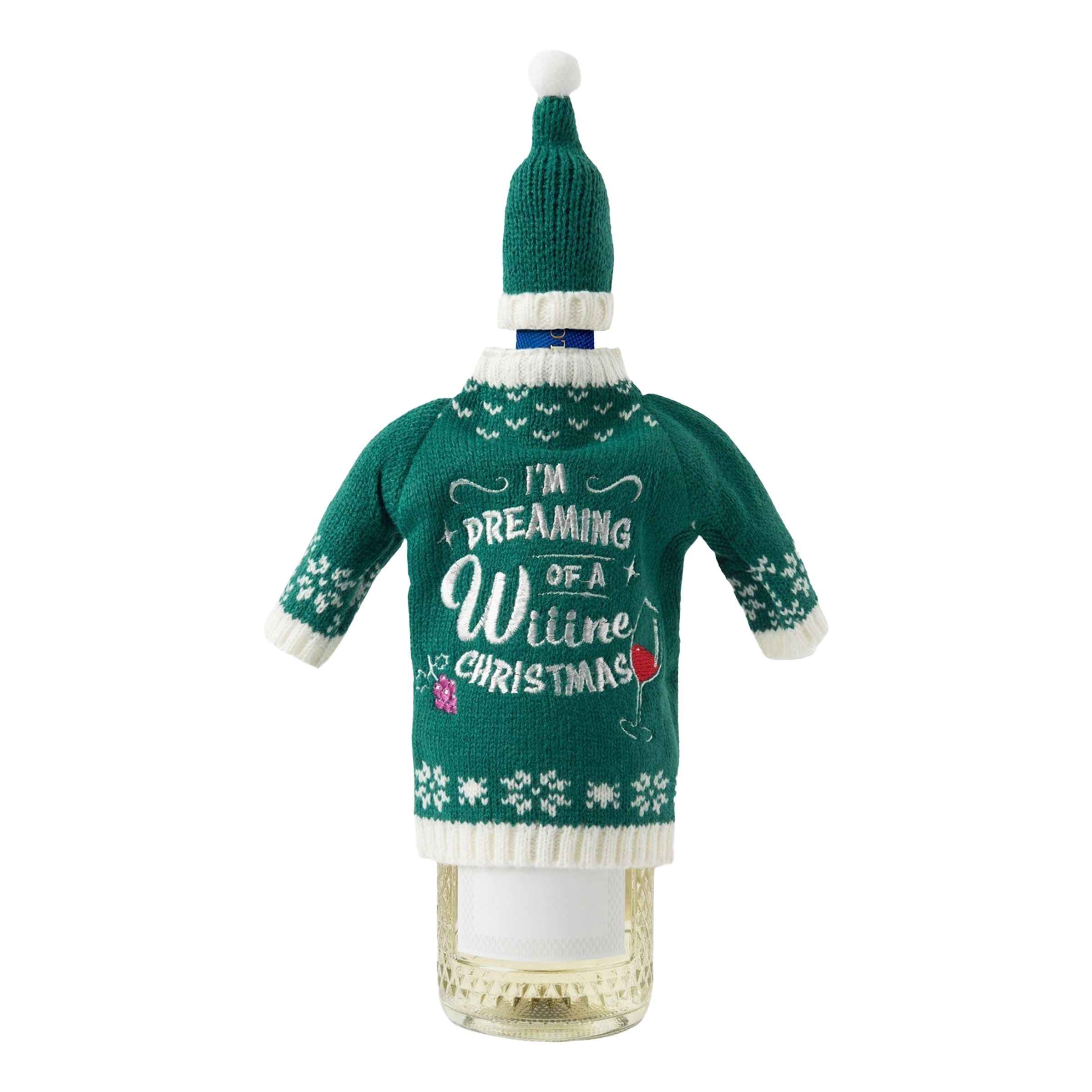 Wine Christmas Flasktröja består av en liten tomteluva och en jultröja perfekt för vinflaskan. Dräkten trär du enkelt över flaskan och placerar luvan på toppen av flaskan.