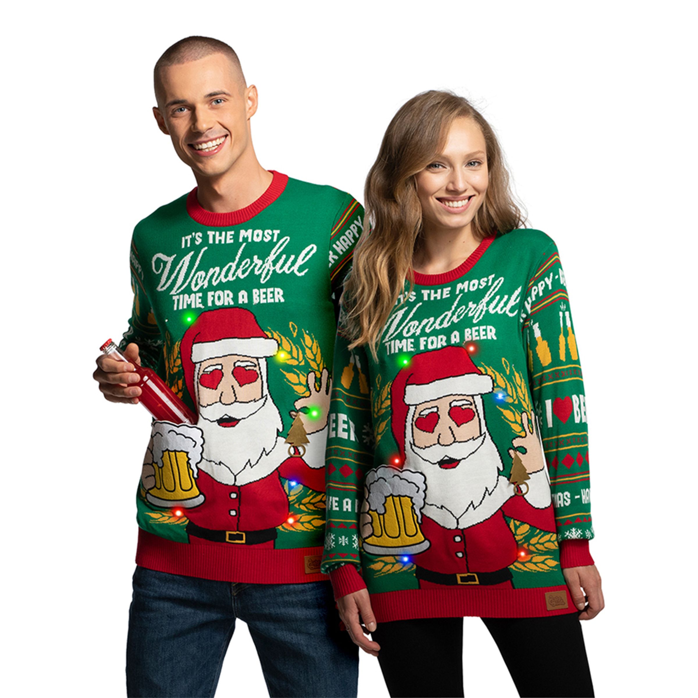Wonderful Time Jultröja är en fantastiskt ful och rolig jultröja med motiv av en tomte som dricker öl och texten: "It's the most wonderful time for a beer". På ryggen och armarna finns motiv av ölflaskor, flingor, roliga texter med mer. Passar både henne och honom. Tröjan kommer i en hel drös olika storlekar och passar till julen.