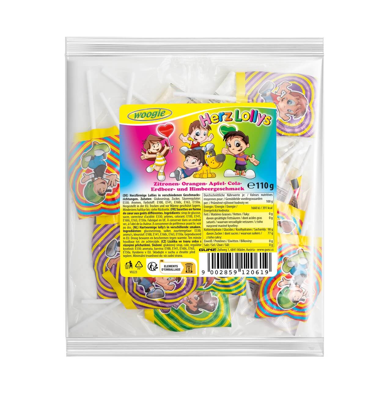 Hjärtformade klubbor i blandade smaker; citron, äpple, apelsin, cola, hallon & jordgubb