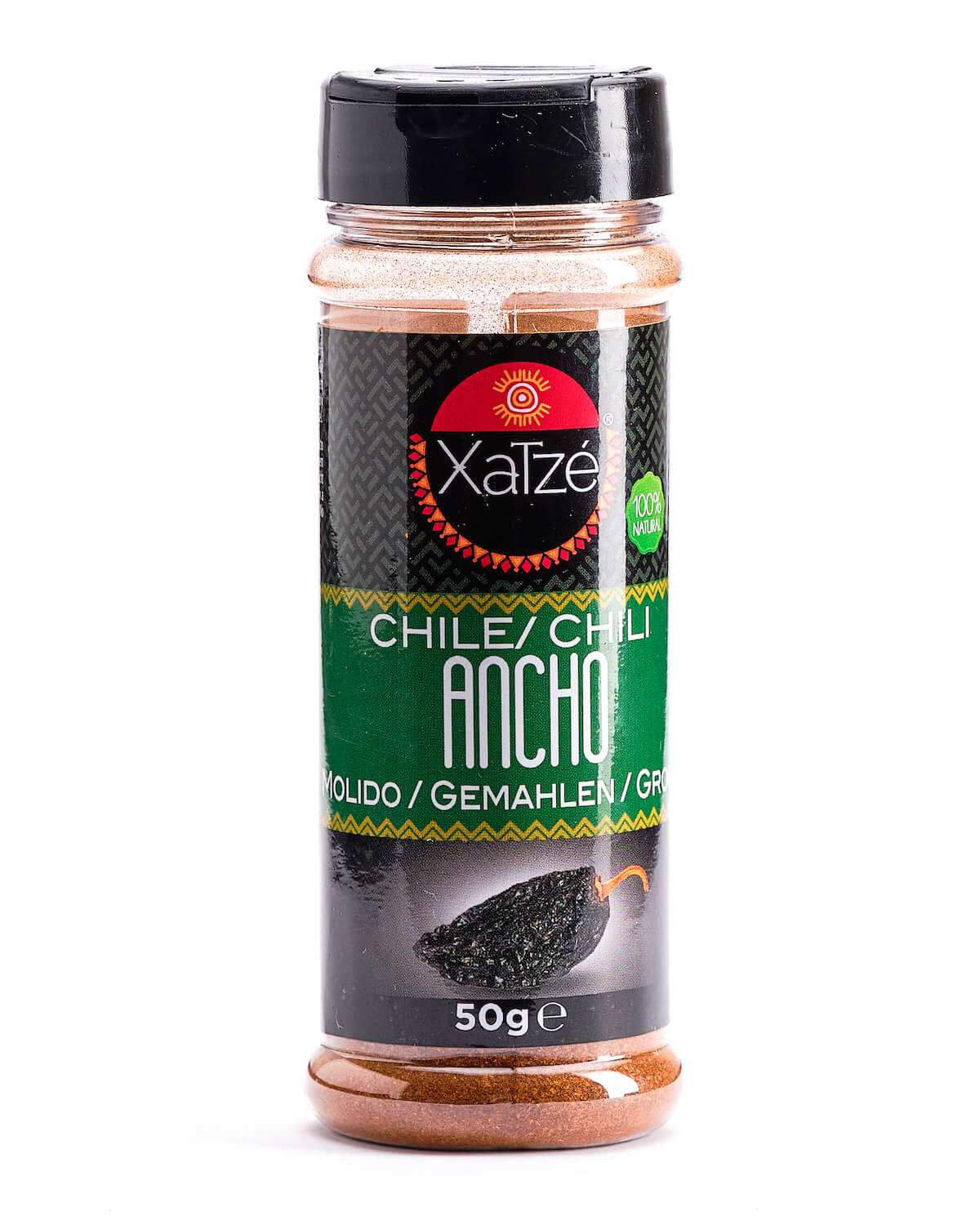 Detta härliga chilipulver från det mexikanska varumärket Xatzé är gjort på ancho chili. Ancho chilin har en lätt syrlig och fruktig smak. Den är generellt relativt mild jämfört med andra sorters chili och har söta toner av katrinplommon. Ancho chilin har ett scoville värde på ungefär 1 000-1 500 jämfört med jalapenon som ligger på ungefär 2 500–3 000. Den används mycket i det mexikanska köket och är användbar som smaksättning i många olika rätter.
