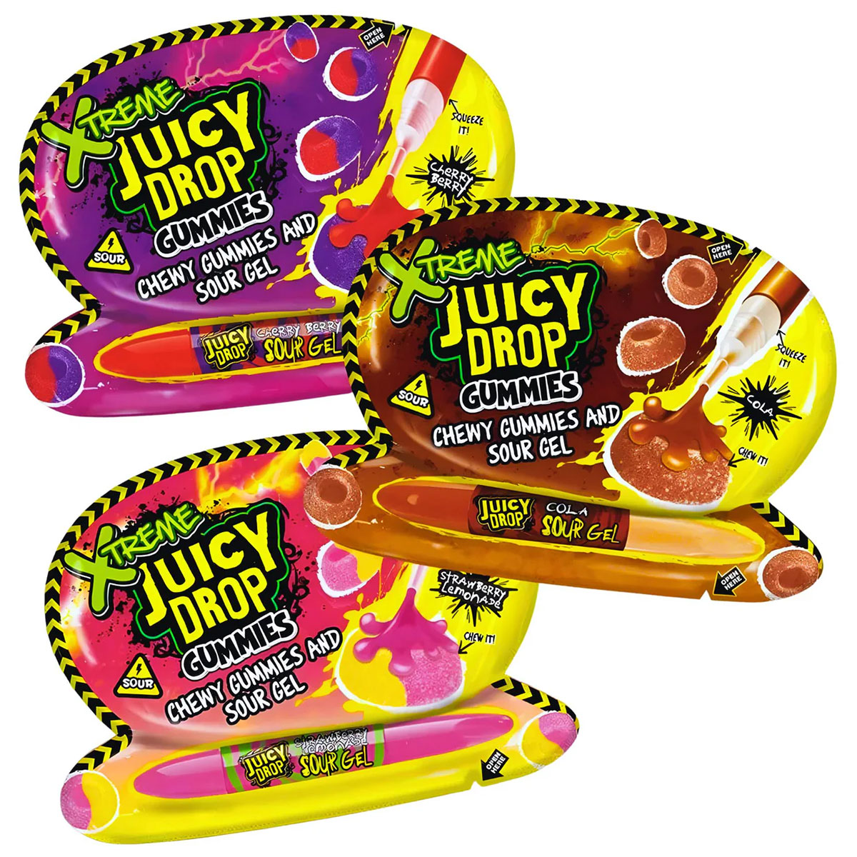 Xtreme Sour Juicy Drop Gummies omfattar en förpackning med mjukt gelégodis och en liten penna som innehåller extremt surt godis-gel. Finns i smakerna cola, jordgubbslemonad och