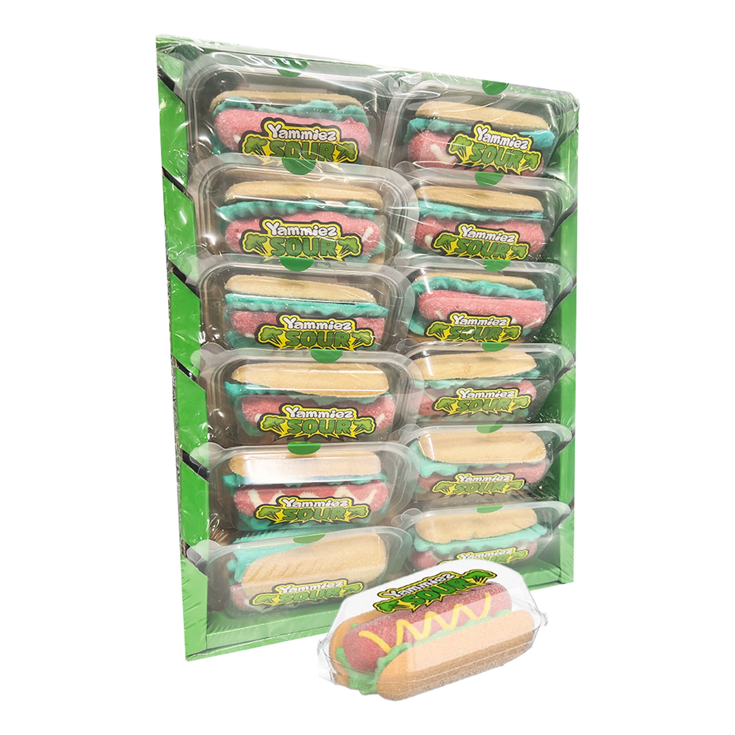 Yammiez Mallow Sour Hot Dog Storpack inkluderar tolv stycken "hot dogs" / korvar tillverkade av surt skumgodis. En körv mäter 5,5 x 9,5 cm.