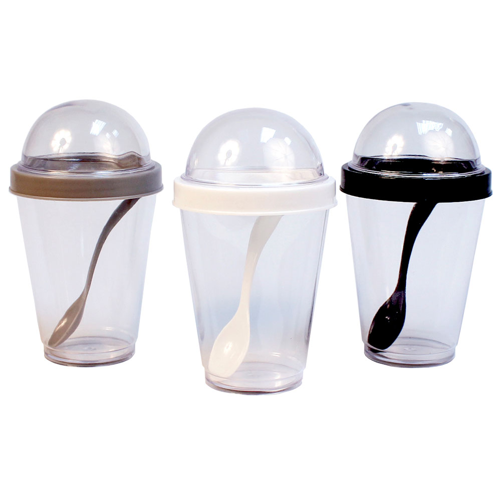 Yoghurtmugg med Sked omfattar en plastmugg med ett skruvbart lock med en skruvbar kupol som går att fylla med t.ex. mussli, samt en plastsked. Finns i färgerna grå, vit och svart, vilken du får blir en överraskning.