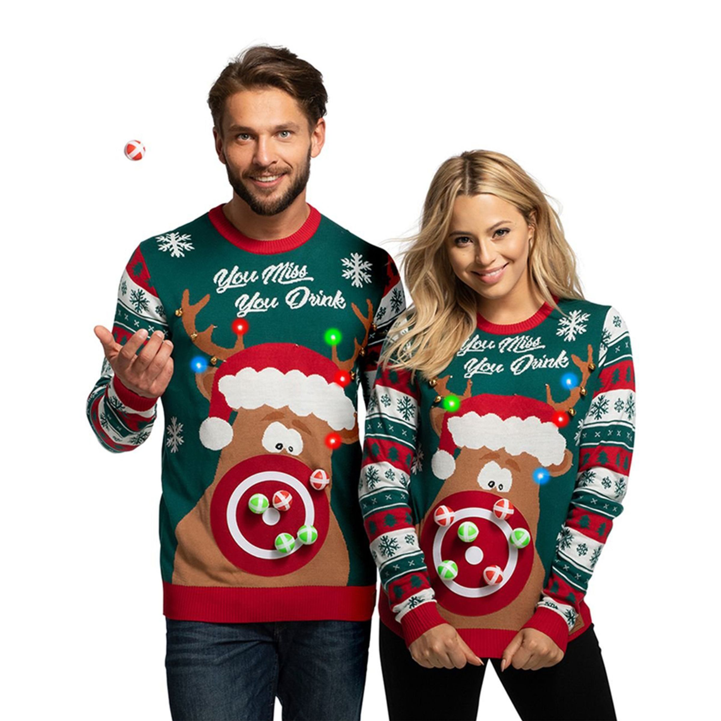 You Miss You Drink LED Jultröja är en fantastisk jultröja med motiv av en julren, LED-lampor, en pricktavla och texten: "You Miss, You Drink". Tröjan kommer i en hel drös olika storlekar och passar både henne och honom. Tröjan är tillverkad i ett finstickat akrylmaterial och passar lika bra att bära på julafton som till julfesten med jobbet eller kompisarna. På jultröjan finns flertalet LED-lampor som blinkar och lyser i olika färger. Lamporna drivs av 2 x CR2032-batterier som ej medföljer, men som kan köpas till. Sex stycken bollar att kasta medföljer i röd och grön färg.