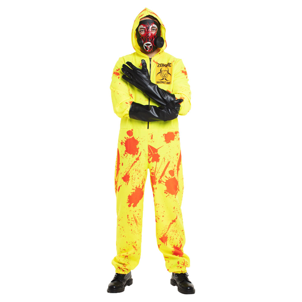 Zombie Hunter Maskeraddräkt Deluxe omfattar en gul jumpsuit full av blodstänk och blodfläckar samt ett Zombie och strålningsmärke med en dödskalle vid bröstet. Dräkten har huva och dragkedja framtill. Svarta långa handskar i läderimitation medföljer. Dräkten är tillverkad i polyester och passar vuxna.